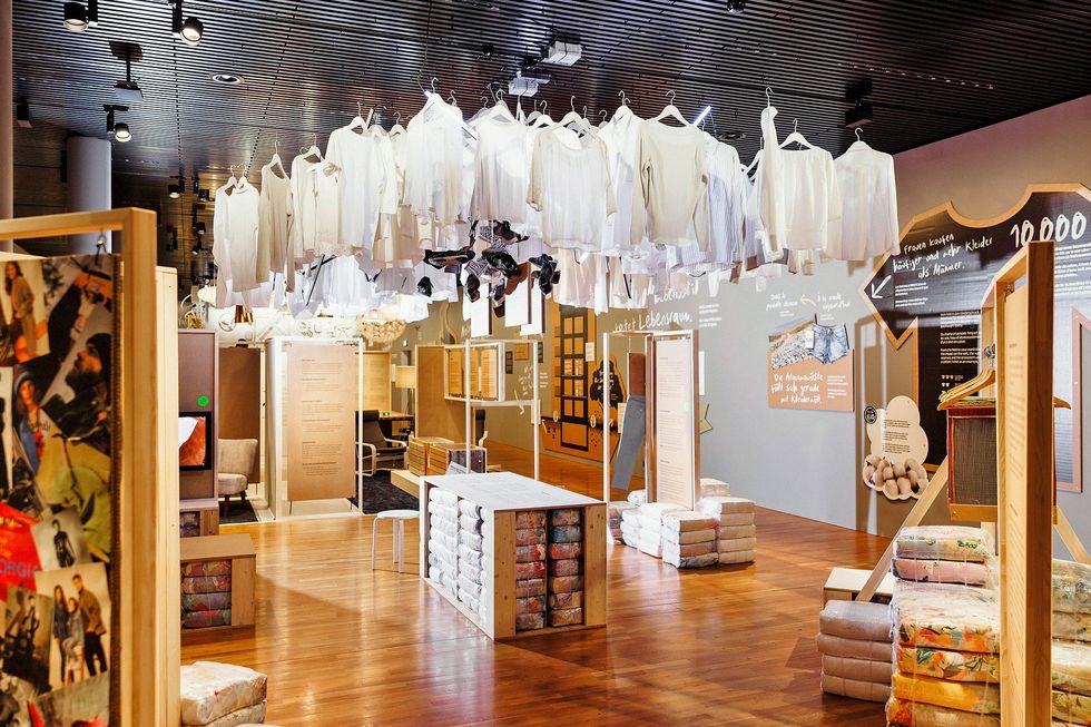 In der Kleiderecke wird einem das Phänomen der sogenannten «Fast Fashion» erklärt: Heute werden jährlich 150 Milliarden T-Shirts verkauft. Auf unserem Planeten leben aber «nur» 8 Milliarden Menschen. Das ergibt in der Gesamtsumme über 18 neue Shirts pro Person und Jahr. Dadurch entstehen enorme Umweltbelastungen.