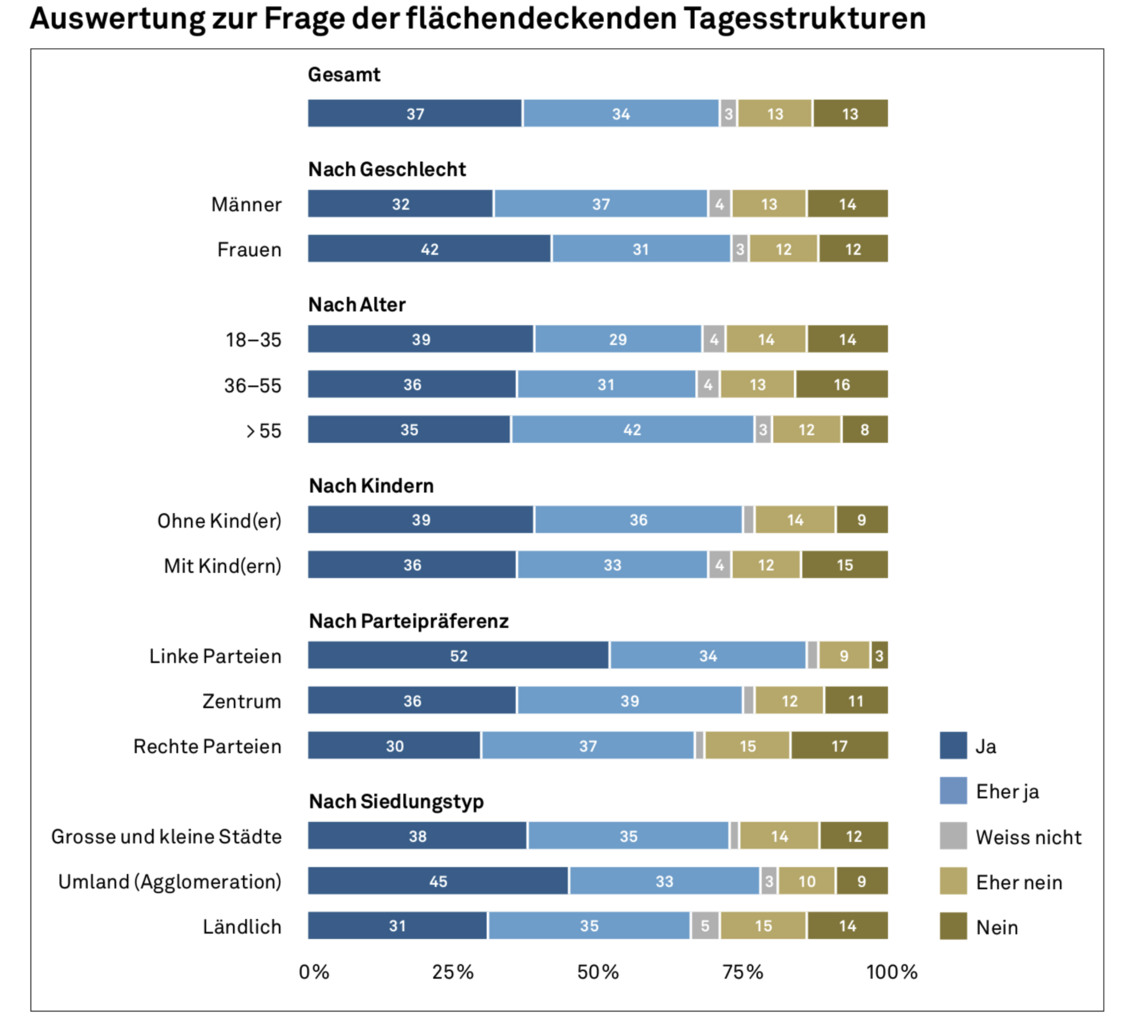 Der Teufel steckt wie so oft im Detail. Die Mercator-Studie zeigt interessante Tendenzen bei den Bedürfnissen. Die Autorinnen und Autoren vermeiden aber zu konkrete Interpretationen für die konkrete Umsetzung. Sie schreiben zwar von Tagesschulen und Tagesstrukturen, vermeiden aber klare Definitionen.