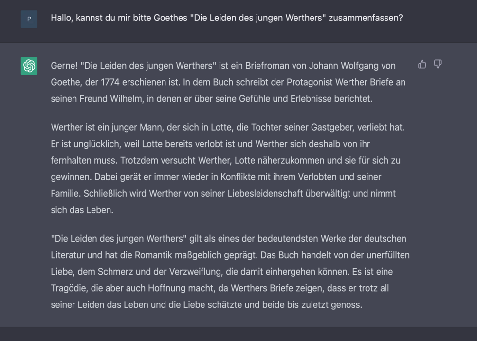 Dennoch vermag das Sprachmodell mit seinen Fähigkeiten zu beeindrucken. Es liefert innert Sekunden ausführliche Antworten auf verschiedenste Fragen – auf Deutsch und noch etwas besser auf Englisch, da das Modell dafür mehr Trainingsdaten gefüttert bekam.